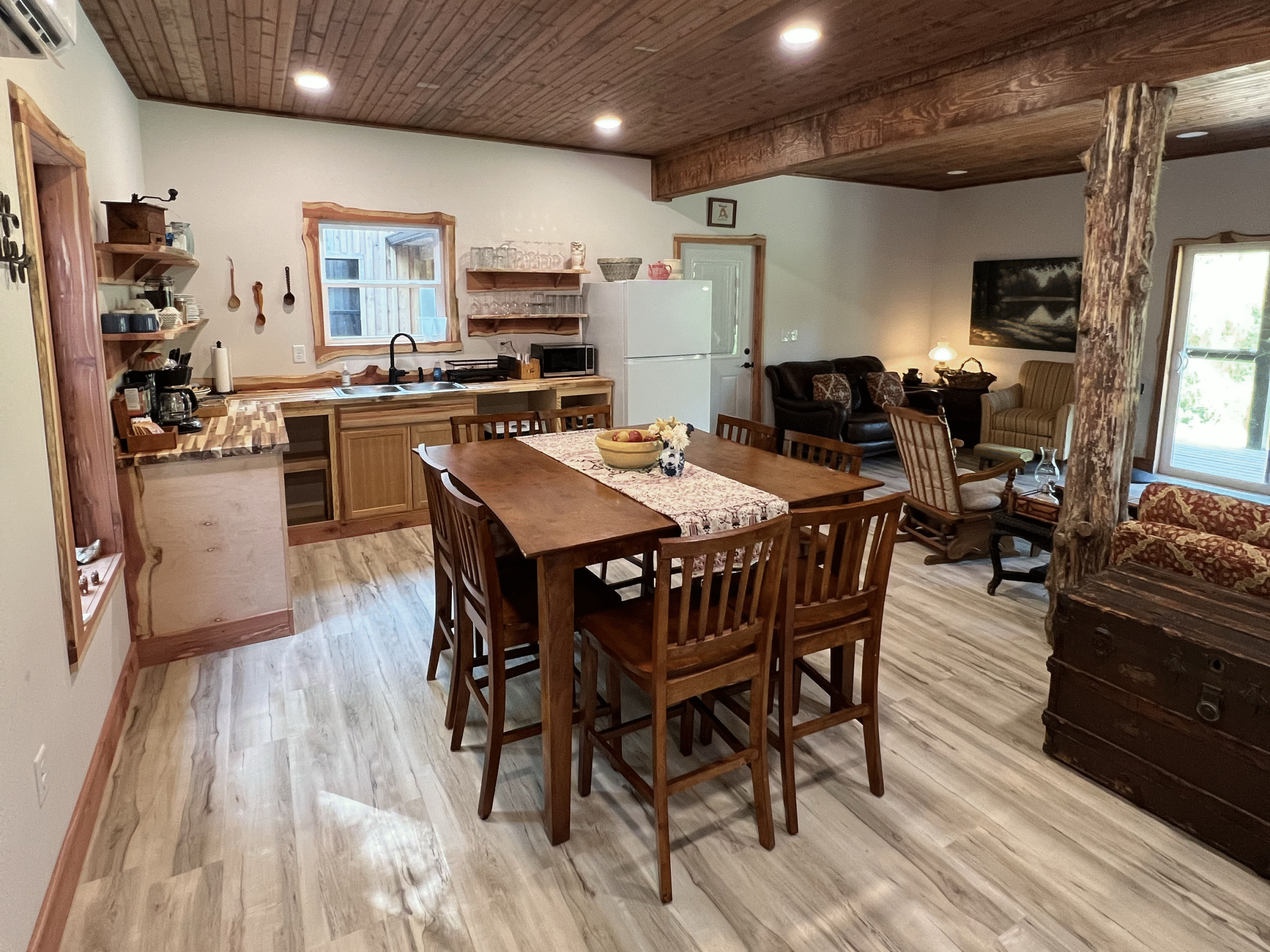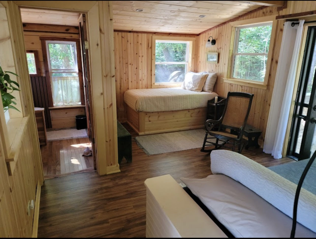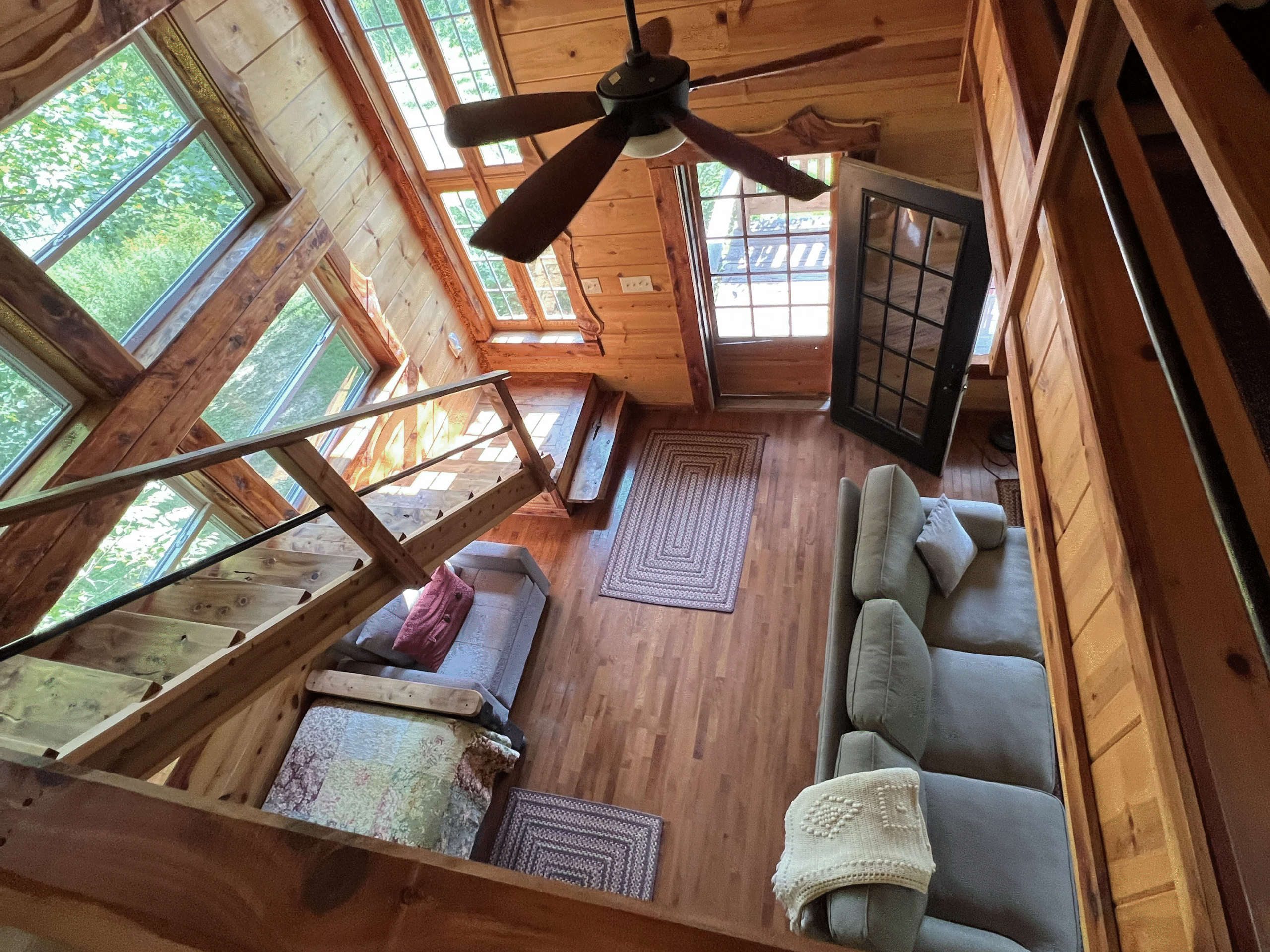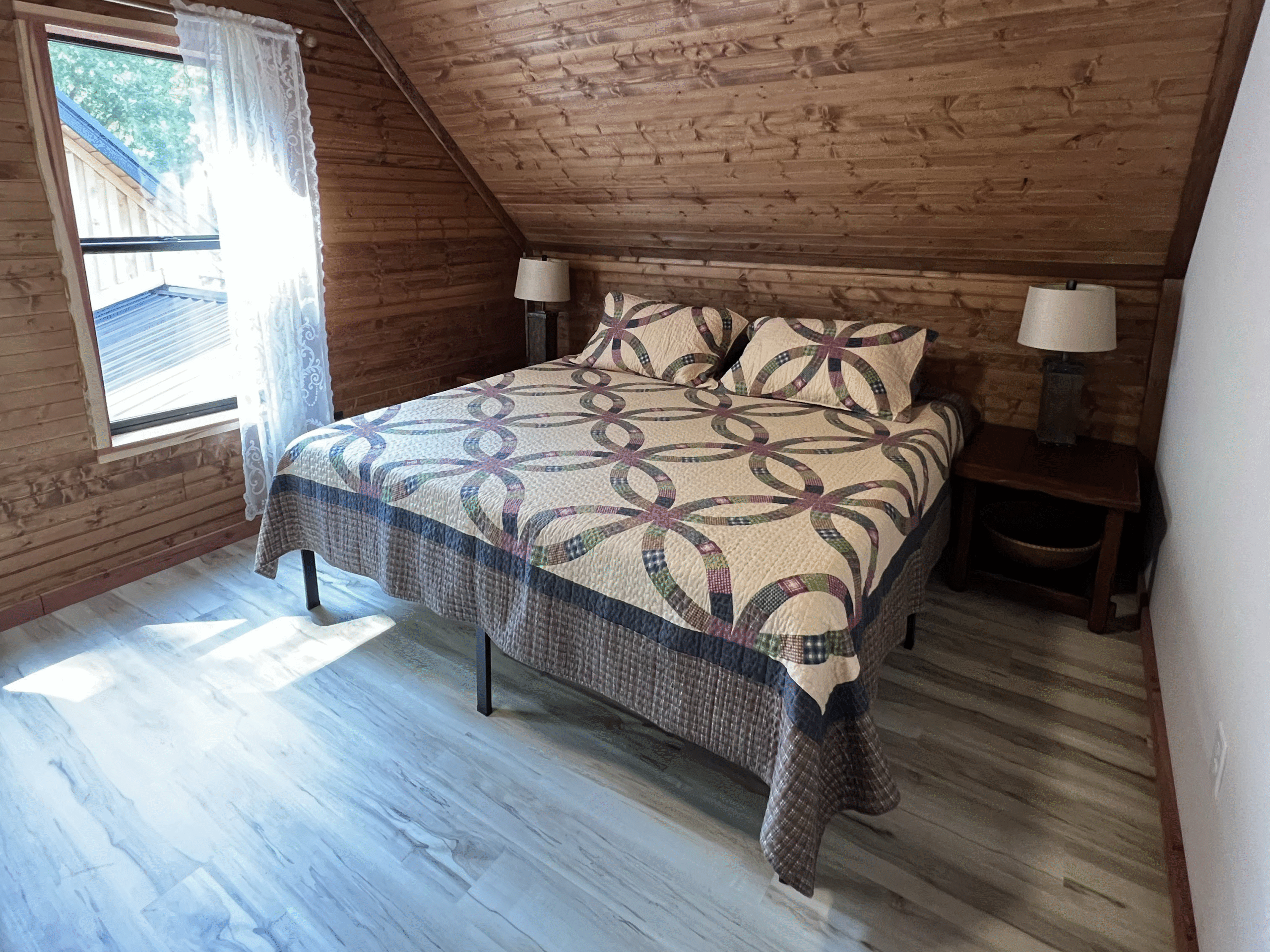 The Cottage with a View, is our most recent creation. Sitting on the front porch you will agree this is the Cabin with a View! Large living room, games, fireplace, sleeping loft, bath/shower and a well stocked snacking kitchen with fridge, microwave, dishes, coffee, spring water, and more. King bed, three twin beds, and a sleeper couch…. will accommodate up to seven. Private screened porch for seasonal dining. (air conditioned)
