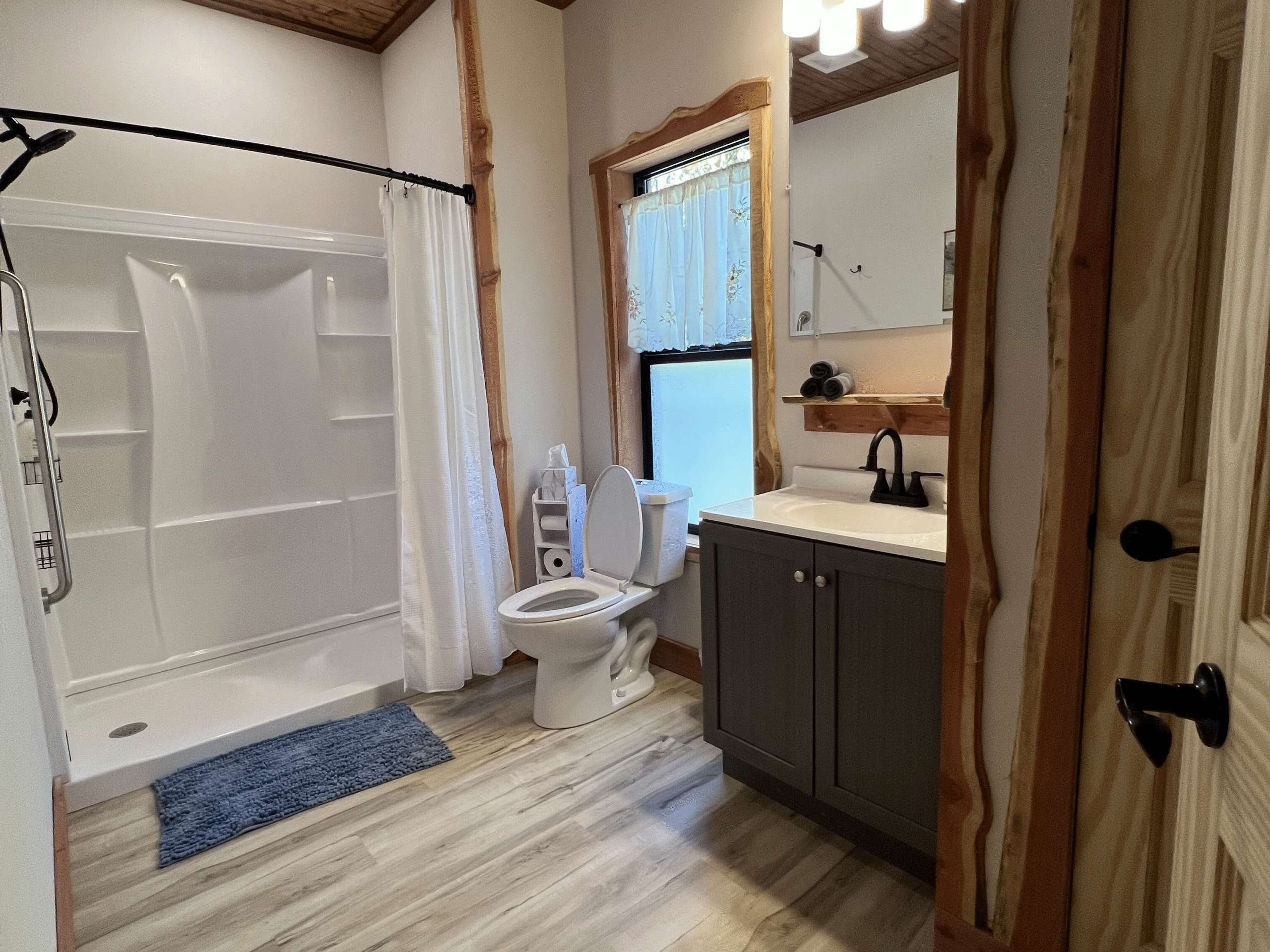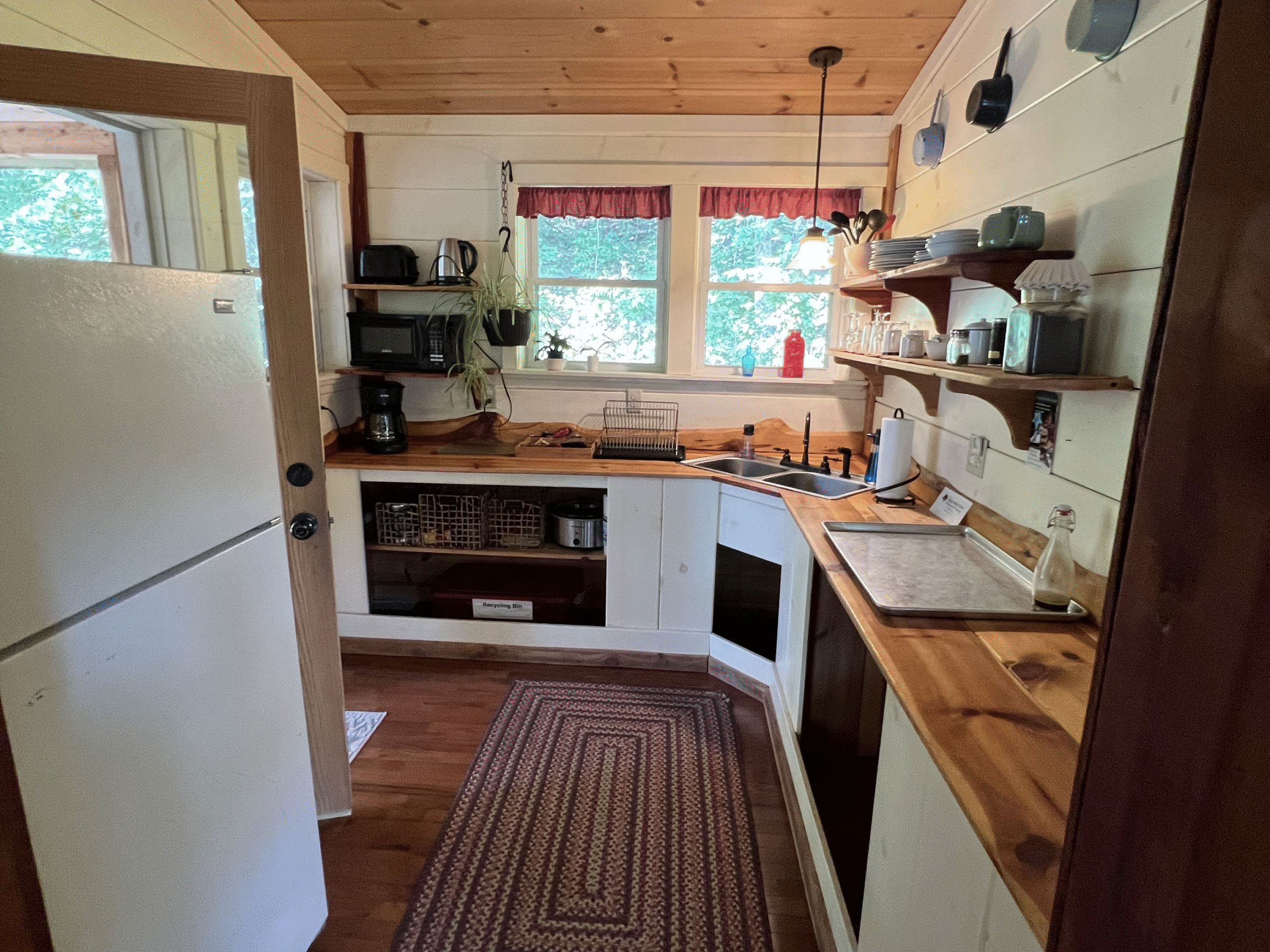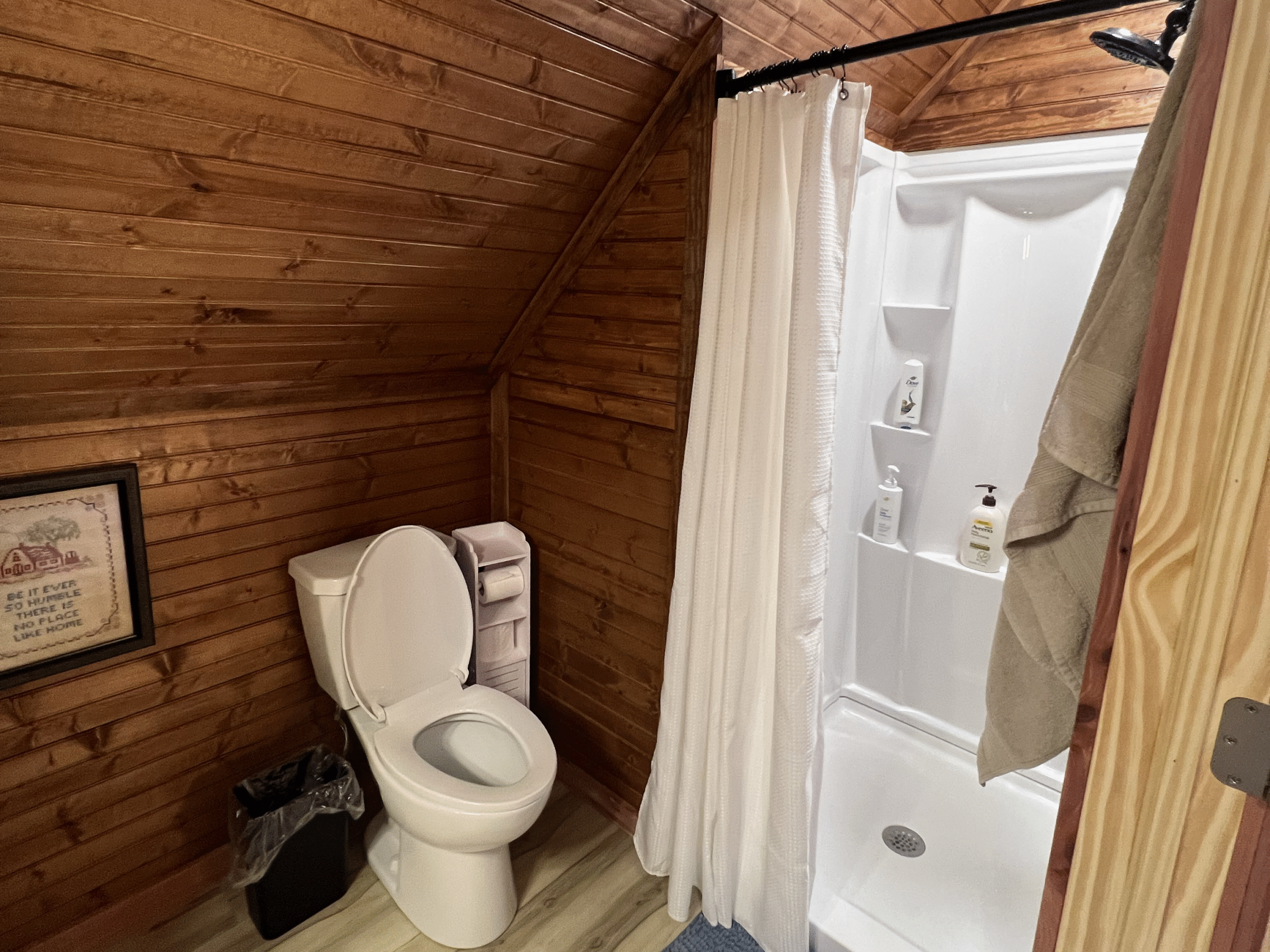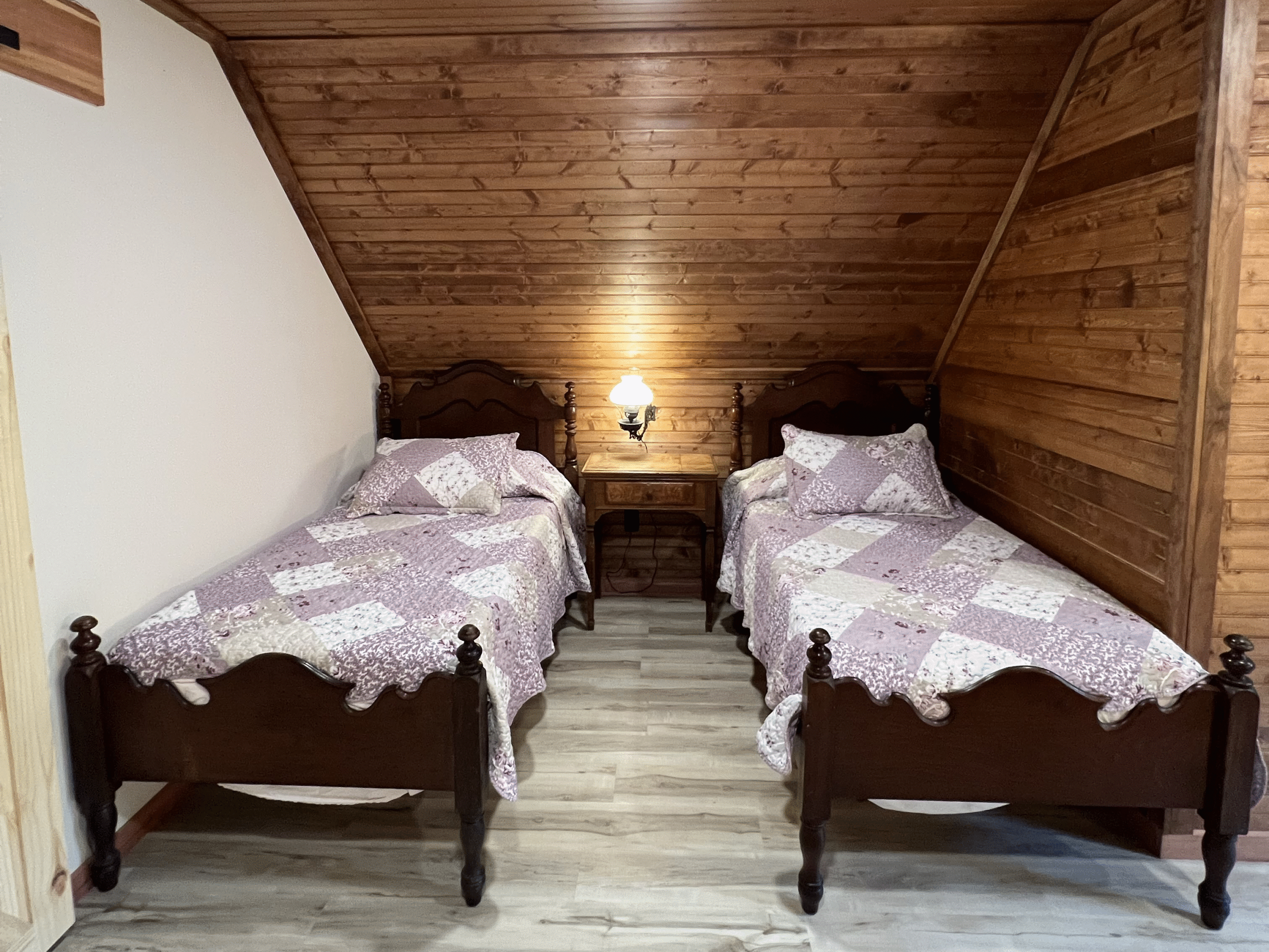 The Cottage with a View, is our most recent creation. Sitting on the front porch you will agree this is the Cabin with a View! Large living room, games, fireplace, sleeping loft, bath/shower and a well stocked snacking kitchen with fridge, microwave, dishes, coffee, spring water, and more. King bed, three twin beds, and a sleeper couch…. will accommodate up to seven. Private screened porch for seasonal dining. (air conditioned)