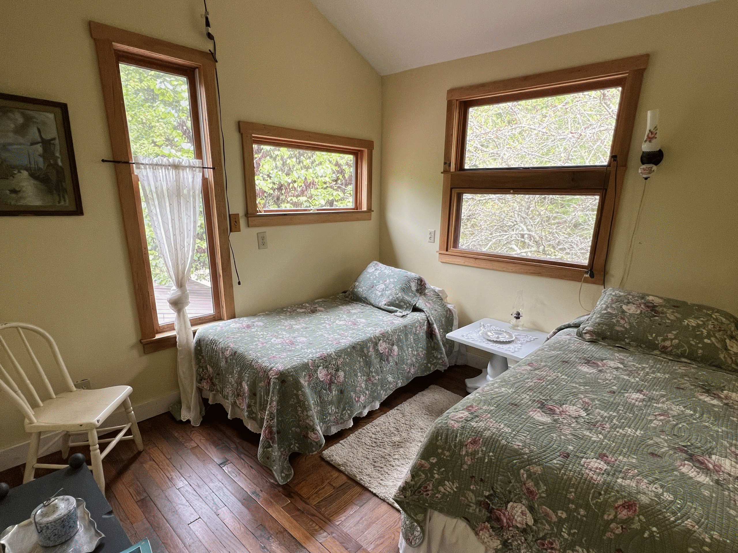 The Cabin by the Creek is nestled in the trees and makes it very private with wrap around porches and windows. Roomy and open, this cabin has a queen bed, and 2 twins, a bath/shower and a well stocked snacking kitchen with fridge, microwave, dishes, coffee, spring water, and more. The cedar/pine cabin is in a world of its own, making it perfect for honeymoons, anniversary celebrations or retreats!