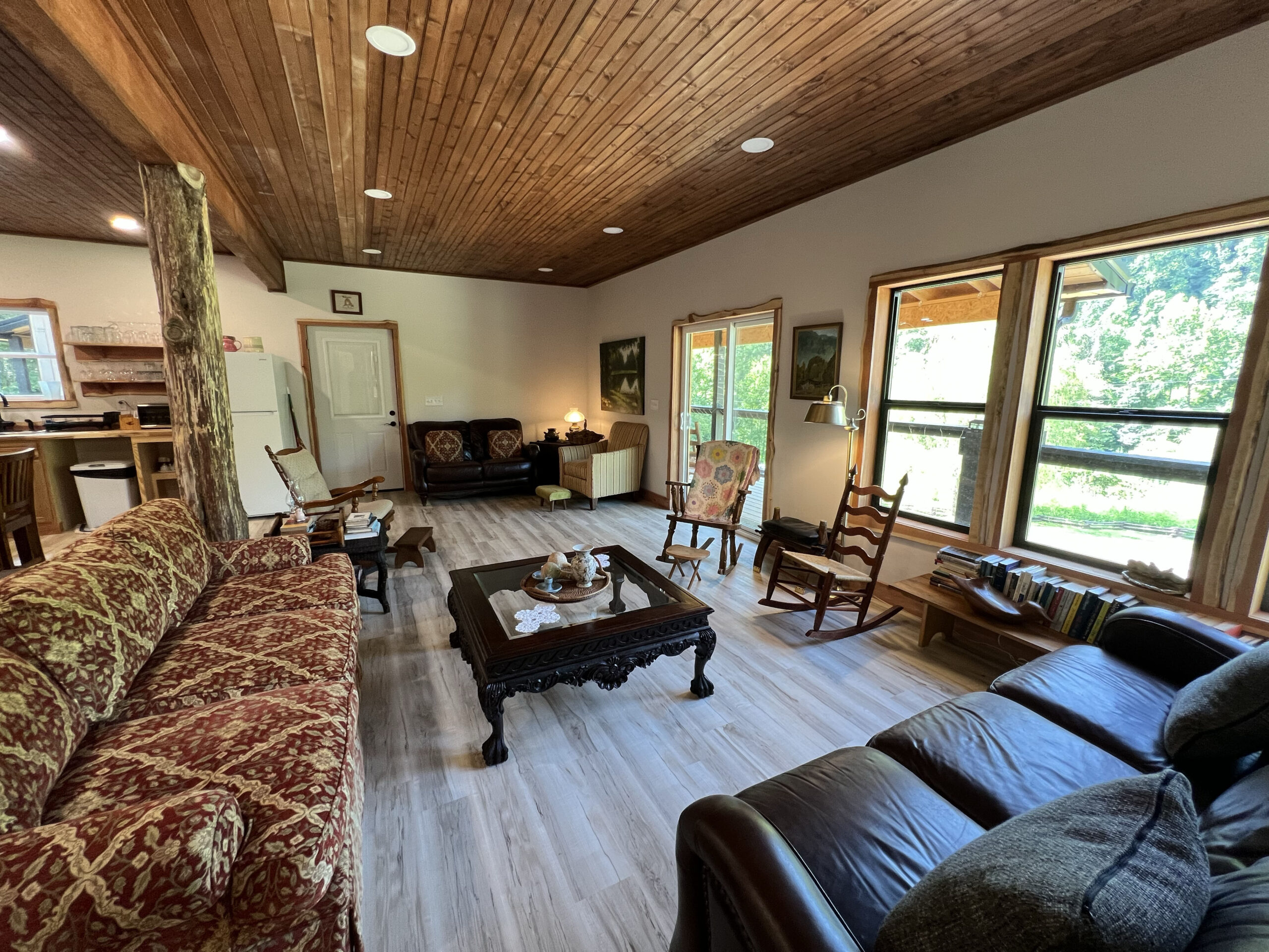 With room to sleep 8–10 guests comfortably, River Cane features two full bathrooms, a generous open living area, and thoughtful design that invites calm in every corner. The cabin’s namesake nods to the native river cane groves that once flourished along Kentucky’s creeks and lowlands—offering protection, nourishment, and sacred space for generations. Inside, natural pine walls glow with morning light, while cozy nooks and soft linens provide warmth as evening settles in. A wide front porch opens to the hills and hollers of Snug Hollow, inviting slow mornings, laughter-filled evenings, and the quiet kind of magic that only happens off the grid. Perfect for those seeking rejuvenation, community, or a deep breath of fresh air, the River Cane Retreat is your home for heartfelt gathering in the heart of Appalachia.
